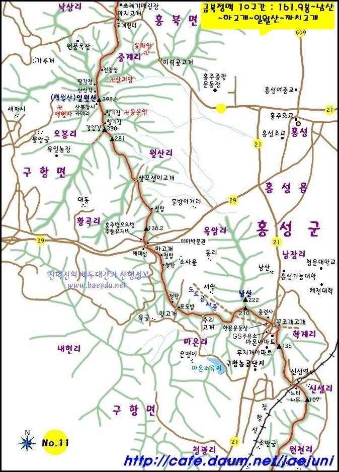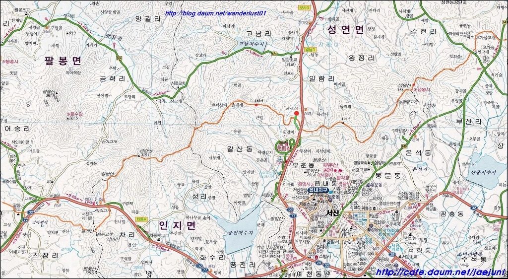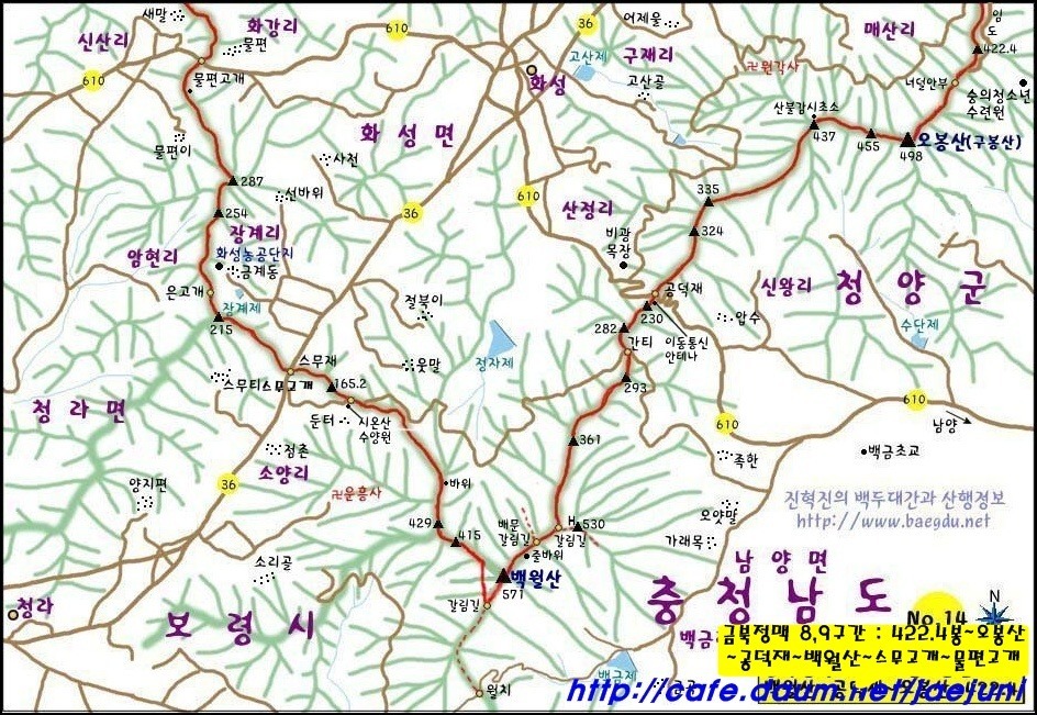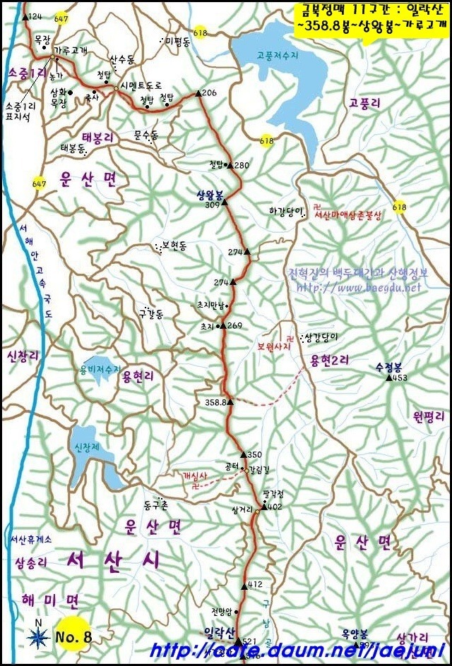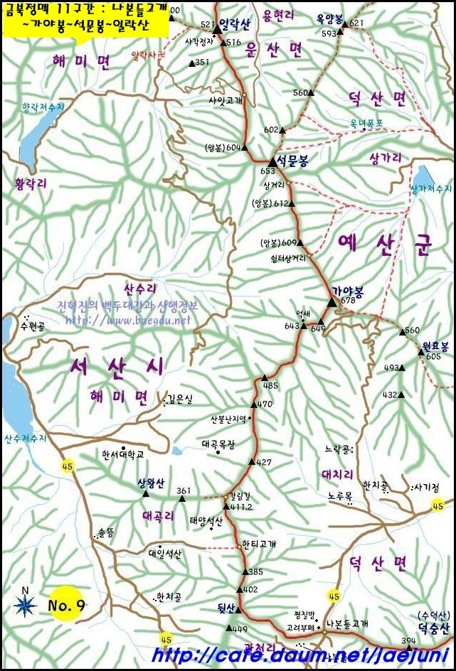 가야산(678m)과 일락산(521m)을 올라 은봉산(283m)에 이르고 다시 서쪽으로 뻗었다.