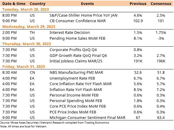 전 세계 중앙은행들이 금리를 계속 인상함에 따라 베트남 중앙은행(SBV)은 3월 15일 기준금리를 100bp 인하했다. 베트남 정부의 결정은 여전히 안정적인 인플레이션율과 높은 경제 성장의 원동력을 고려한 것입니다. 또 베트남 시중은행들이 예금금리를 점차 낮추고 있어 대출금리도 점차 낮아질 전망이다. 3월 23일 대화율은 1.34%(-2.8% WoW)로 떨어졌는데, 이는 2022년 8월 이후 최저 수준입니다. 베트남의 1분기 경제 지표는 이번 주(3월 29일 수요일) 발표될 예정입니다. 베트남 경제가 확인됩니다.